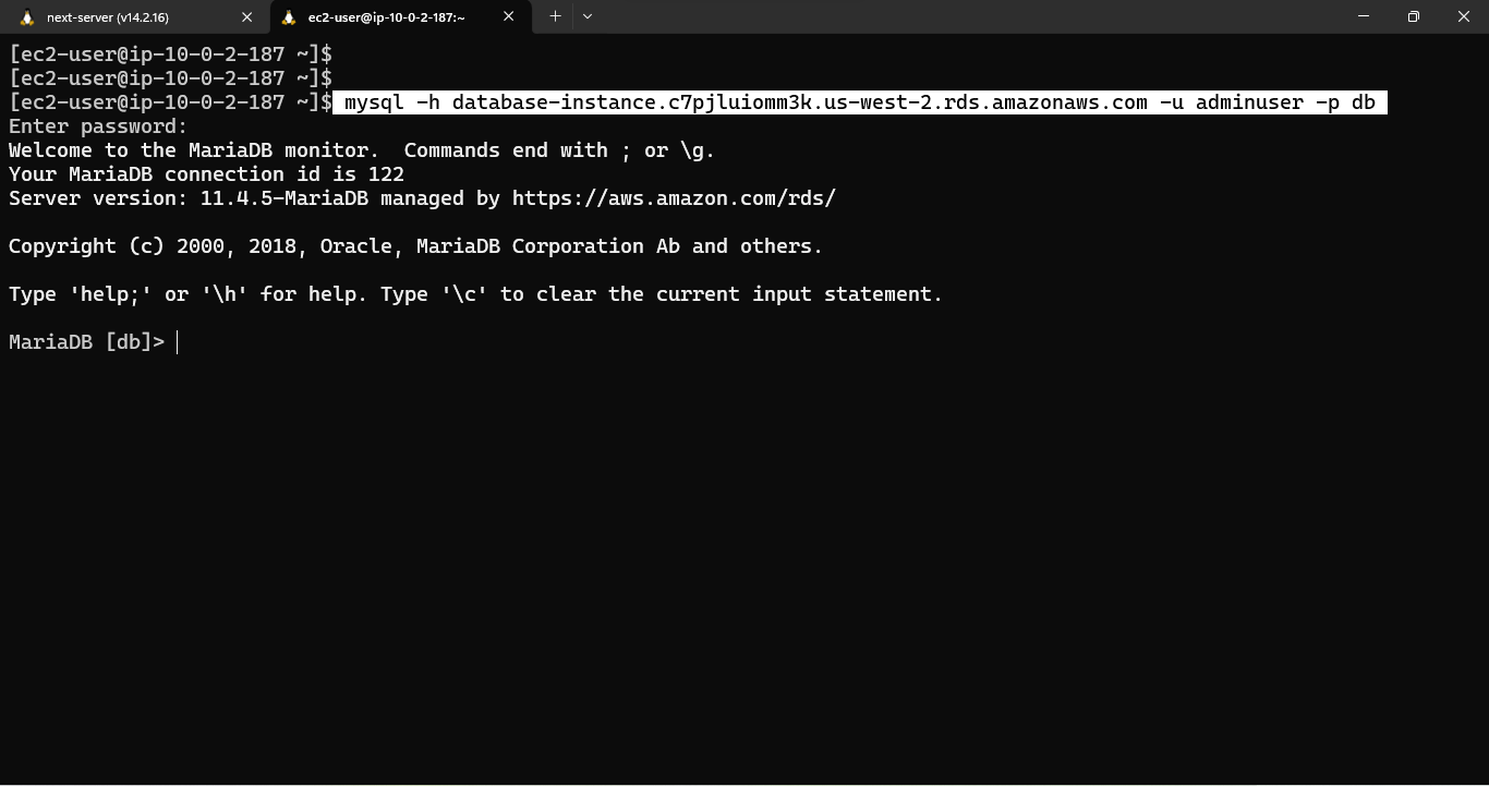 If you see the MariaDB prompt it means the App server can communicate with the Database server