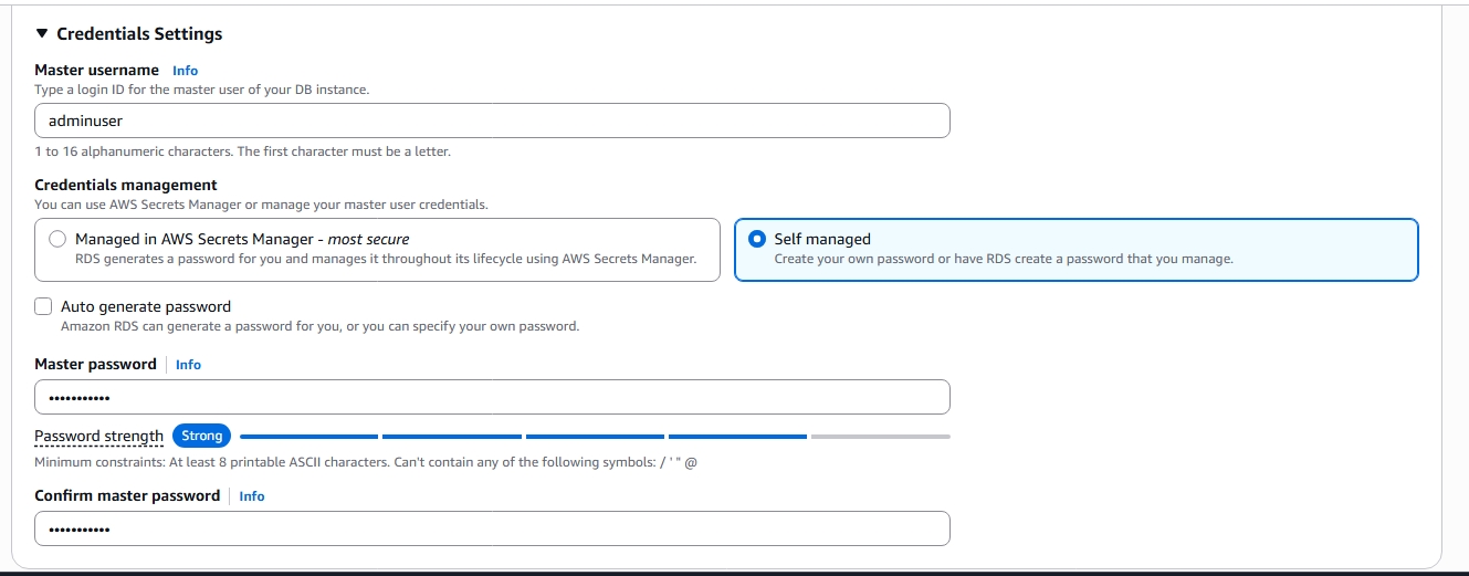 - Master username (in our case "adminuser")